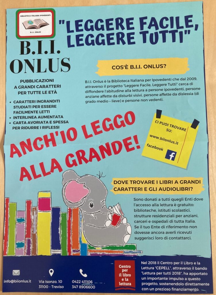 L’adesione ha consentito alla Biblioteca Comunale di accogliere in DONO libri a grandi caratteri, con font atti a facilitare la lettura a persone con dislessia medio-lieve o ipovedenti, e audiolibri.